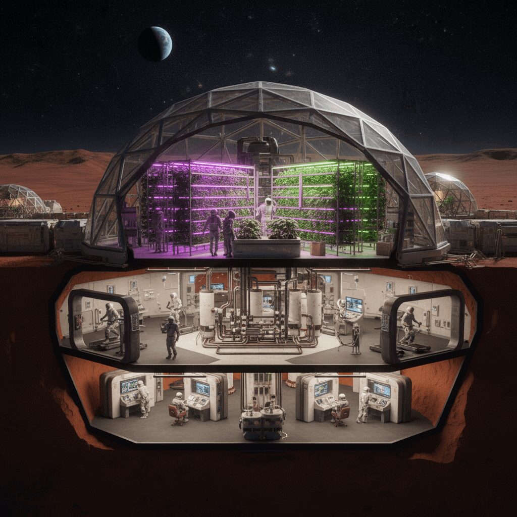 Mars presents both the ultimate challenge and opportunity in space colonization. With a 24-hour day, polar ice caps, and potential subsurface water, it is the favourite target for settlement. But it also requires massive life-support systems, radiation shielding, and sustainable ecosystem design. Concepts for terraforming, sealed habitats, and Martian agriculture are in development. The question: can we build a multi-generational settlement that survives autonomously?
